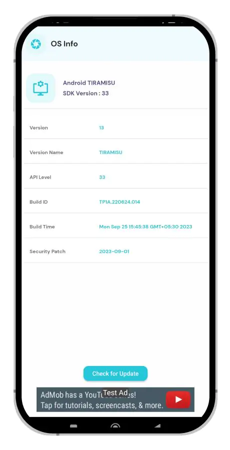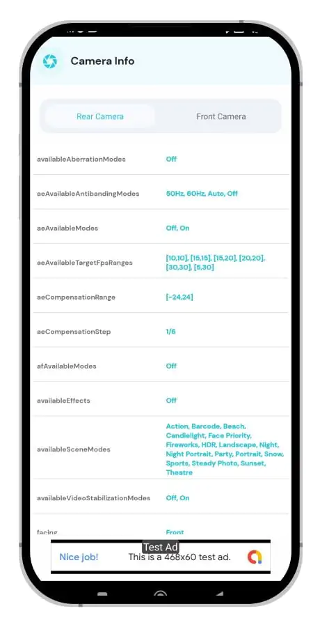 اختبار ومعلومات الكاميرا الأمامية والخلفية.