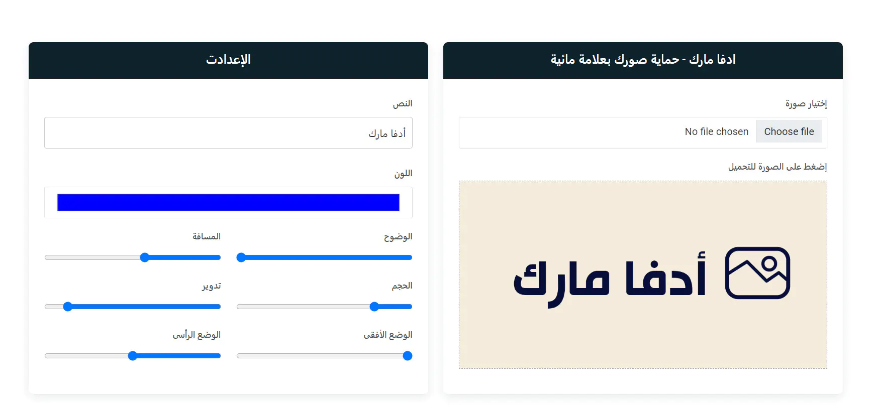 تسمح الأداة أيضًا بإجراء تعديلات على التدوير والتباعد، مما يضمن امتزاج علامتك المائية بسلاسة مع صورتك. ويضمن تصميم ادفامارك النظيف وسريع الاستجابة، المصمم باستخدام Bootstrap، التوافق عبر جميع الأجهزة، مما يوفر تجربة مستخدم سلسة.