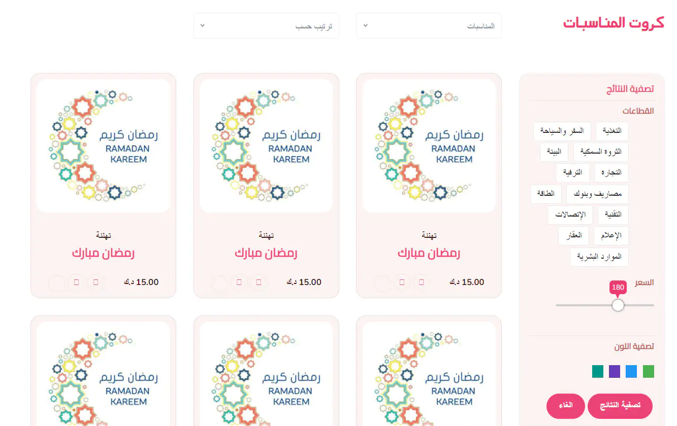 قالب استوك كارد مخصص لمواقع بيع بطاقات الإهداءات أو عرضها بشكل منظم واختيار المناسبات المناسبة. يمكن استخدام القالب أيضًا كموقع للتجارة الإلكترونية.