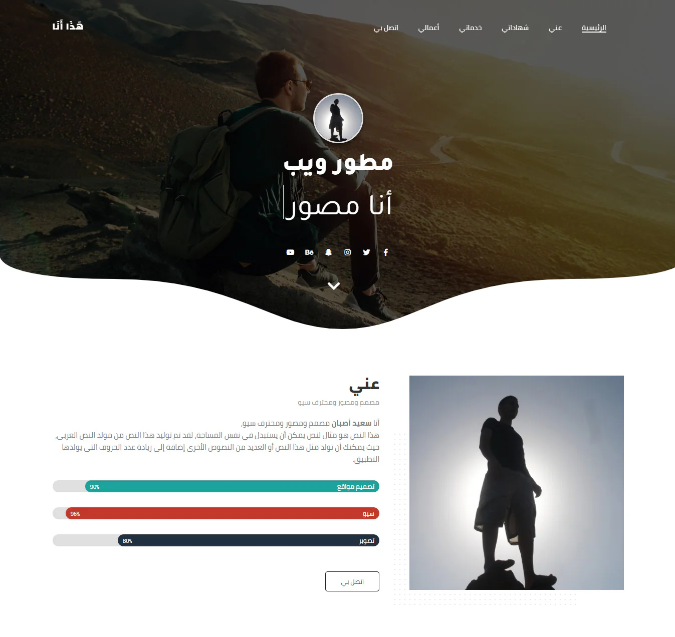قالب من صفحة واحدة مصمم للتعريف بنفسك وشواهدك وخدماتك وأعمالك بطريقة جذابة وحديثة.