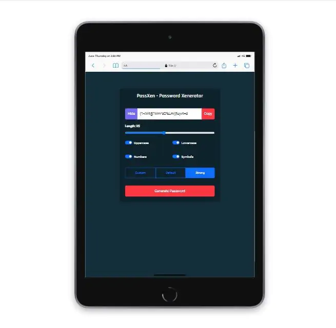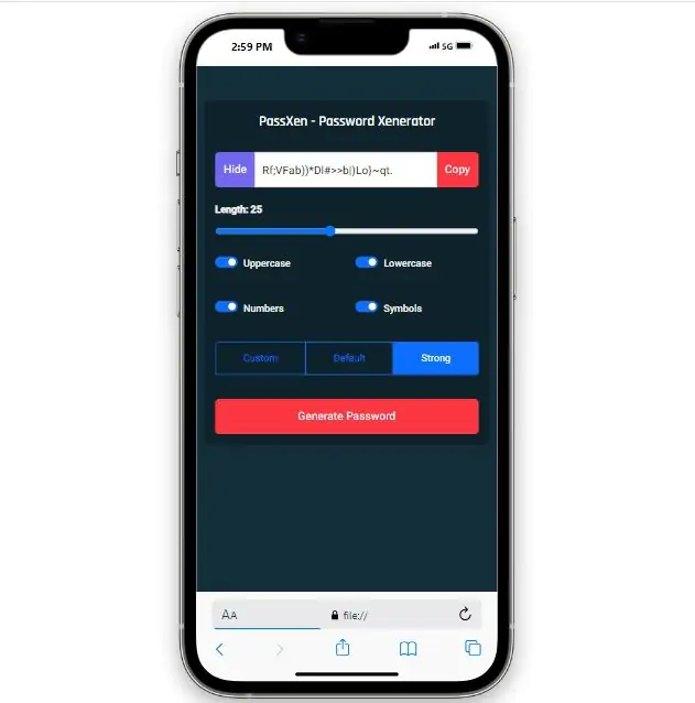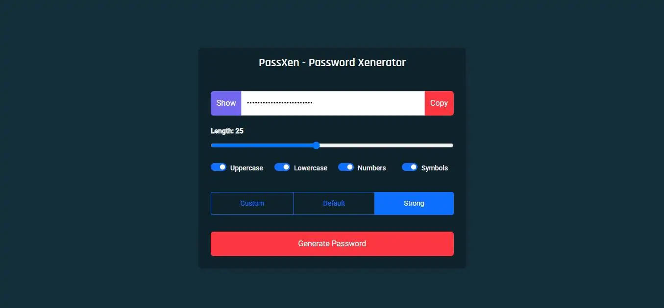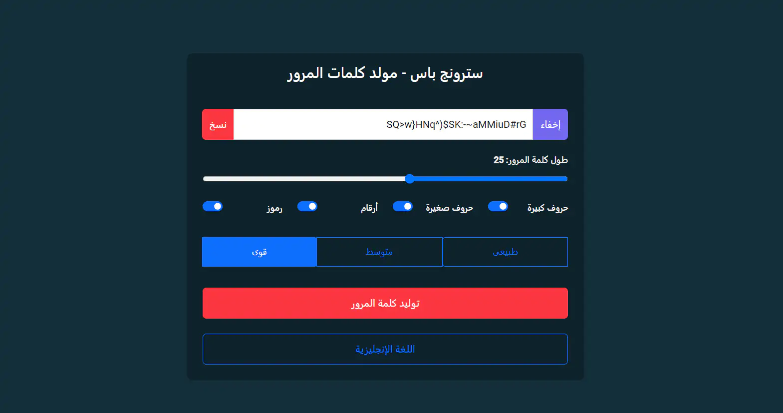 باستخدام سترونج باس، يمكنك تخصيص طول كلمات مرورك من 6 إلى 50 حرفًا والاختيار من بين مجموعة متنوعة من أنواع الأحرف بما في ذلك الأحرف الكبيرة والأحرف الصغيرة والأرقام والرموز. توفر الأداة ثلاثة أوضاع حماية: مخصص، وافتراضي، وقوي، مما يسمح لك بإنشاء كلمات مرور تناسب احتياجاتك الخاصة. تسهل ميزة النسخ الفوري استخدام كلمة مرورك الجديدة على الفور، ويتيح لك خيار إخفاء/إظهار كلمة المرور التحقق من كلمة مرورك بأمان قبل النسخ. صُمم سترونج باس بتصميم نظيف وسريع الاستجابة باستخدام Bootstrap، مما يضمن التوافق عبر جميع الأجهزة.